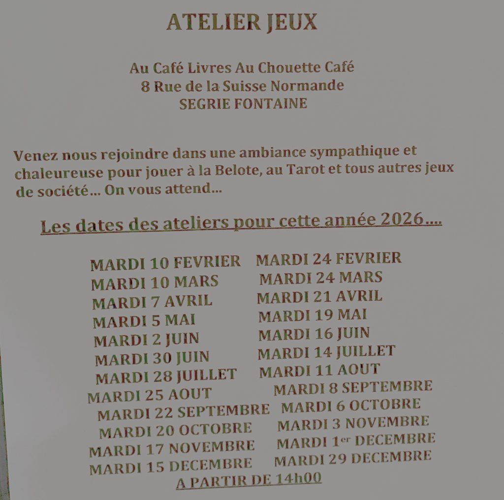 L’ATELIER JEUX (belote, tarot) aura lieu tous les 15 jours à compter du mardi 10 février. À LIRE ET FLÂNER. De 14h à 16h. Référent :